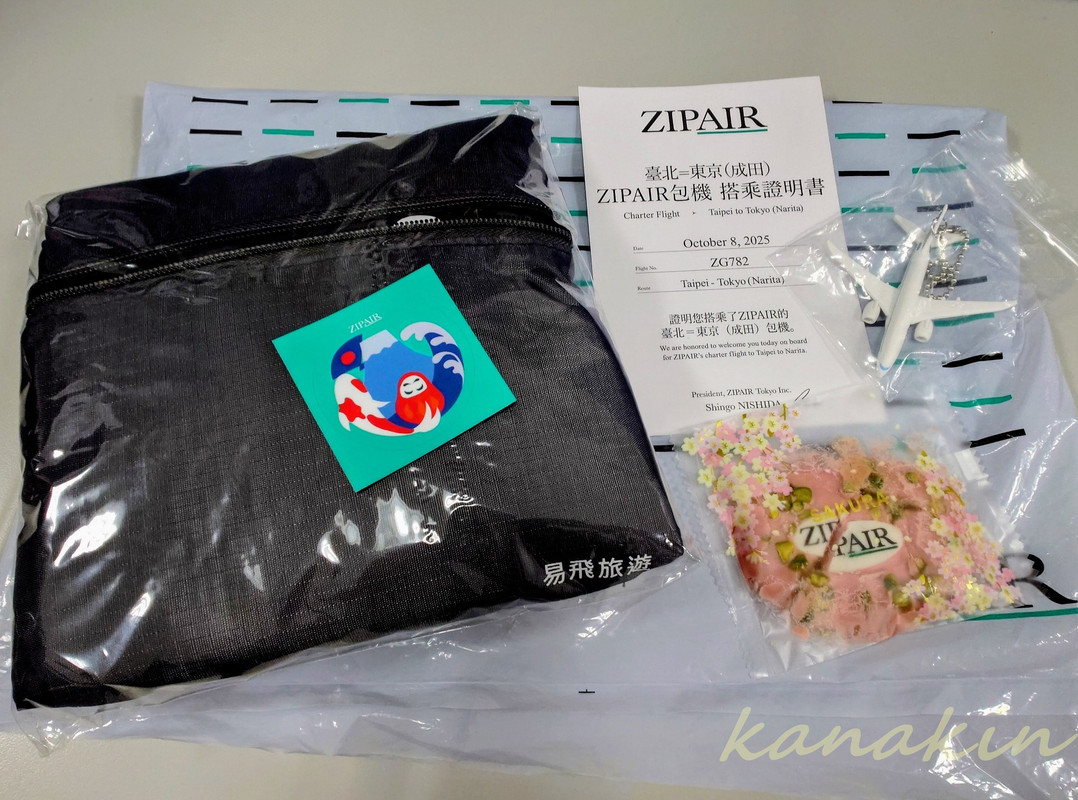 內容物:手提收納袋、貼紙、搭乘證明跟ZIPAIR飛機吊飾