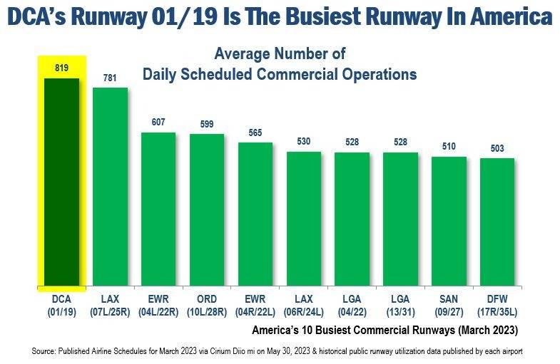 2023年的統計,雷根機場的01/19跑道是全美國最繁忙的跑道,平均每天819架次起降,機