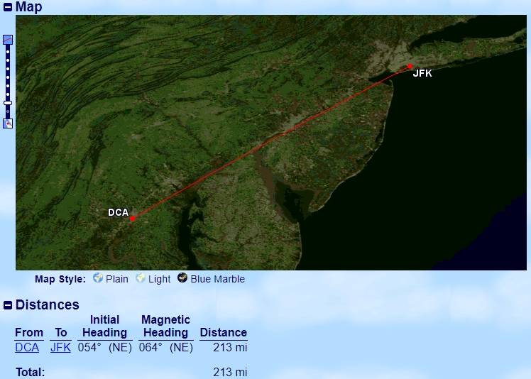 華盛頓特區雷根到紐約甘迺迪距離為 213 miles,預計飛行時間為1小時25分鐘。