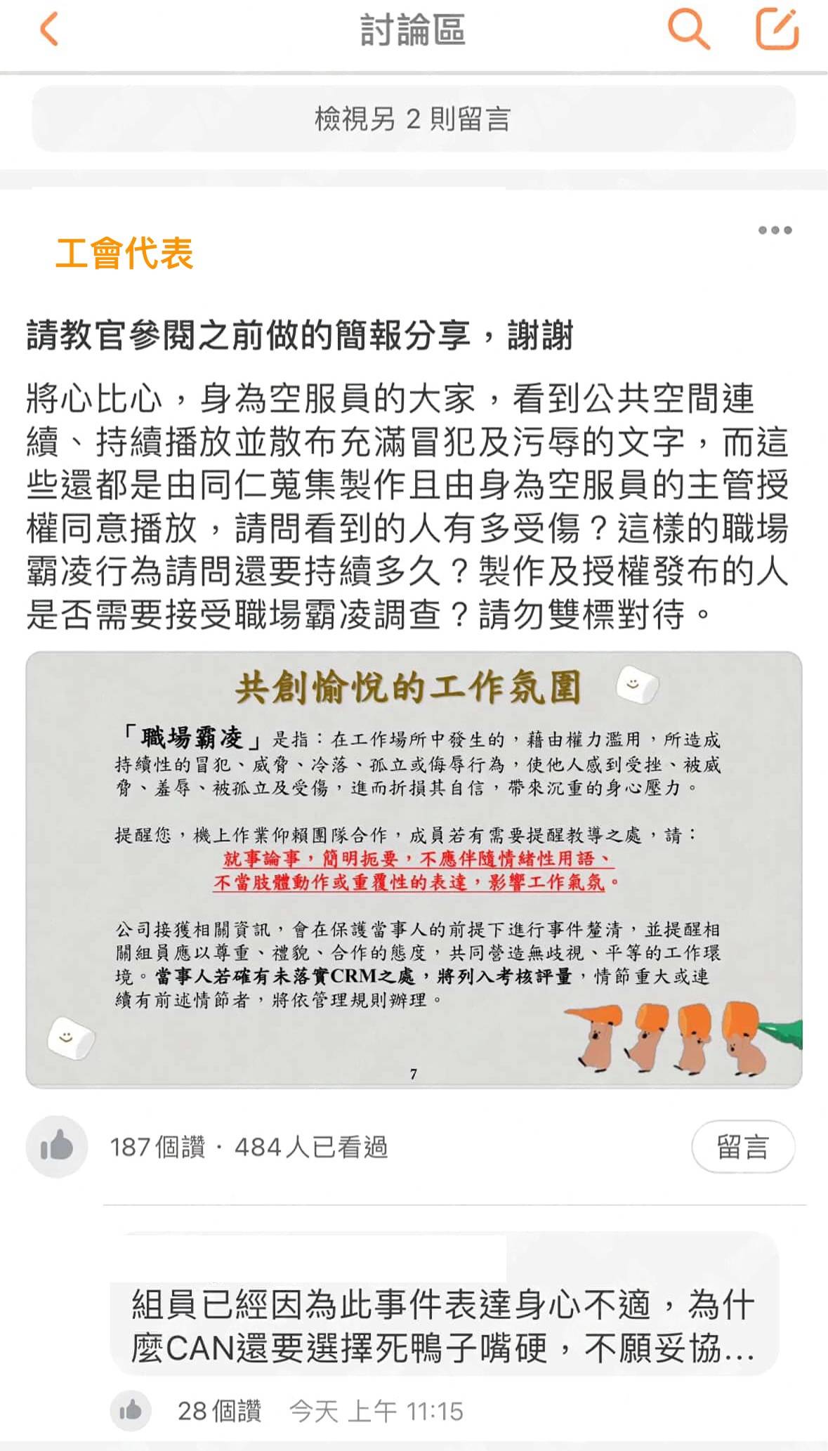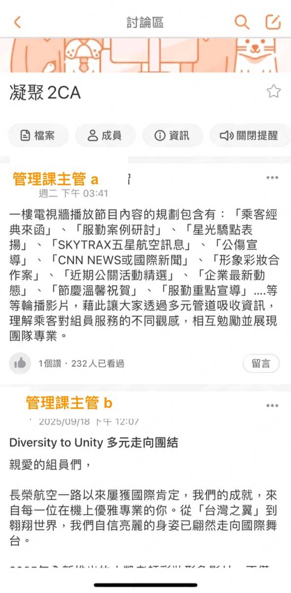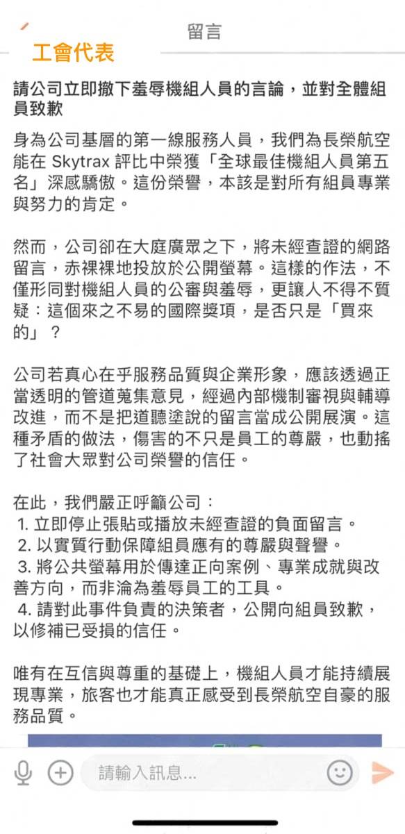 桃園市空服員職業工會就指出,長榮航空將旅客對空服員的抱怨,做成特效影片在公司