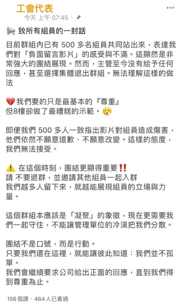 公司再把那個連署群組刪掉,裝沒事,事件前後過了好幾天才撤掉影片