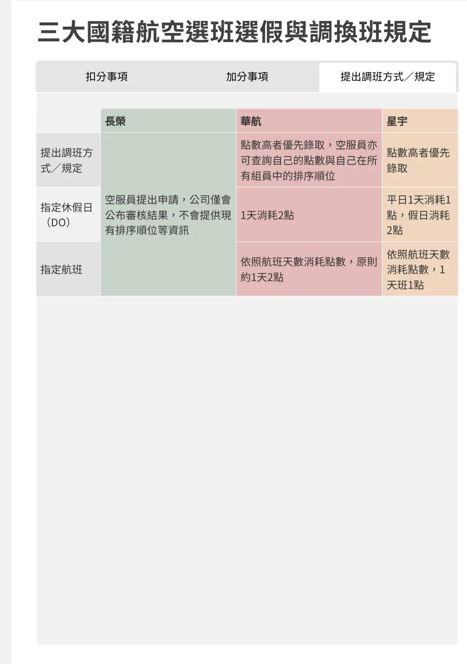 假,遇到有申請人數超出名額時,就依照點數高低依序錄取。與長榮相比,華航取消調換