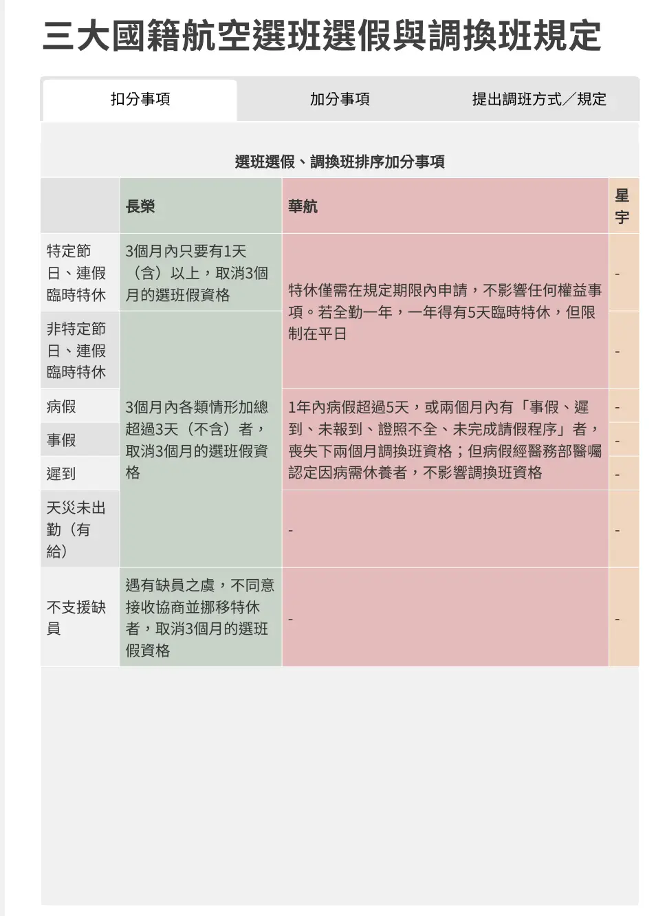 除了選班選假的資格與排序外,長榮的調班跟考績同樣也有類似的規定,只要是在特定節