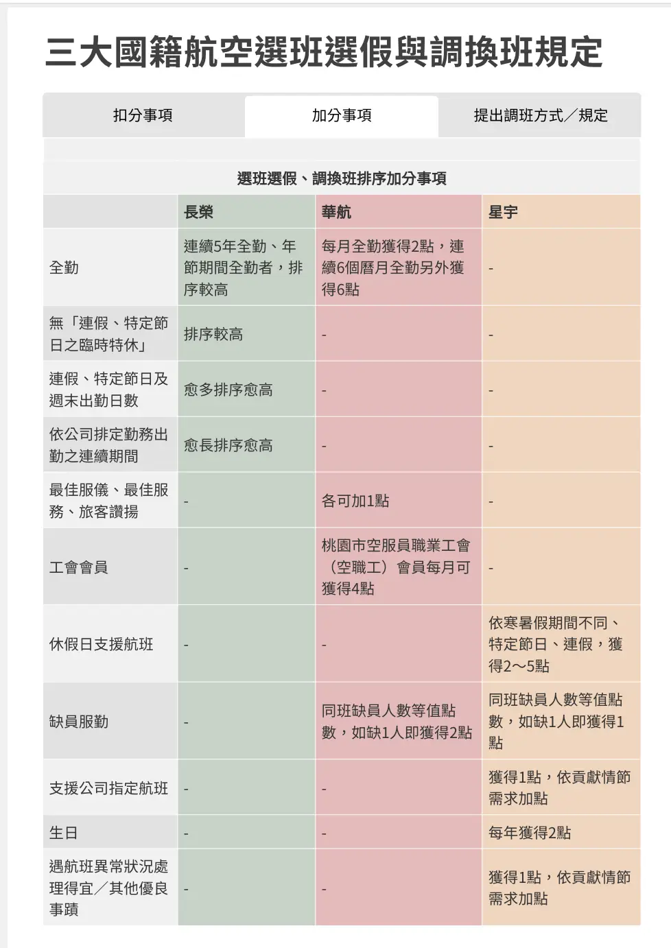 ,只有支援特定航班等被動情況才有機會增加點數,在選班選假的機會並沒有華航跟長榮