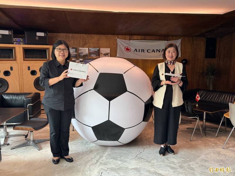 加拿大航空看好世足賽熱潮推出優惠機票。右為台灣總代理航達旅行社總經理李怡萍。(