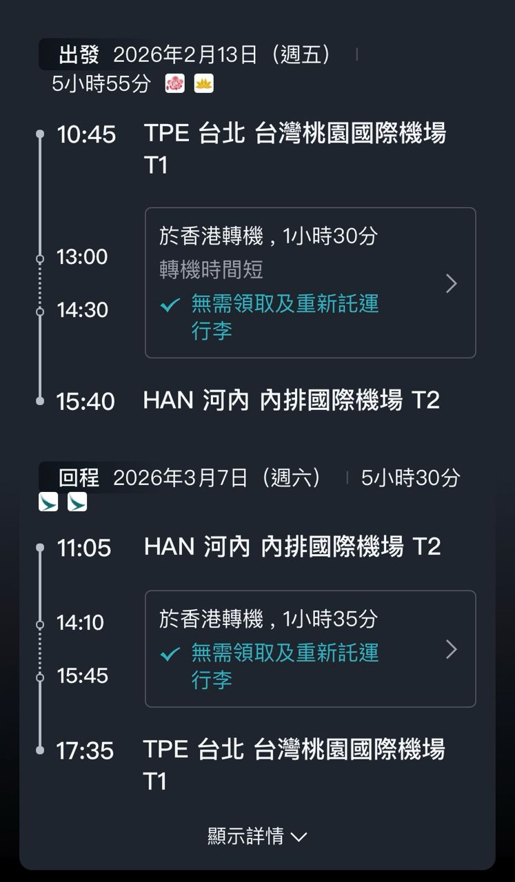 大家好,朋友因爲想回越南過年,但基於預算考量只能走香港轉機,目前查詢到的機票為