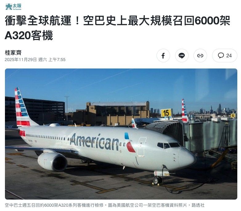 [新聞] 快訊/出國注意!空中巴士「大規模召回A320客機」 台灣恐受影響