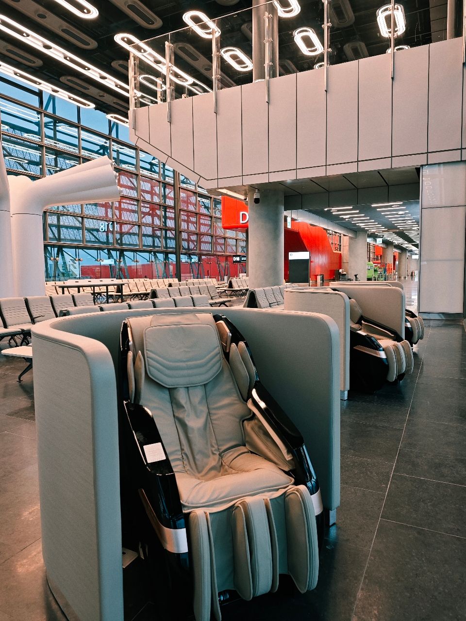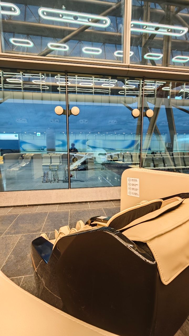 然後我最喜歡的是,每個登機口都有高檔的免費全身按摩椅,而且是正對跑道跟滑行道,