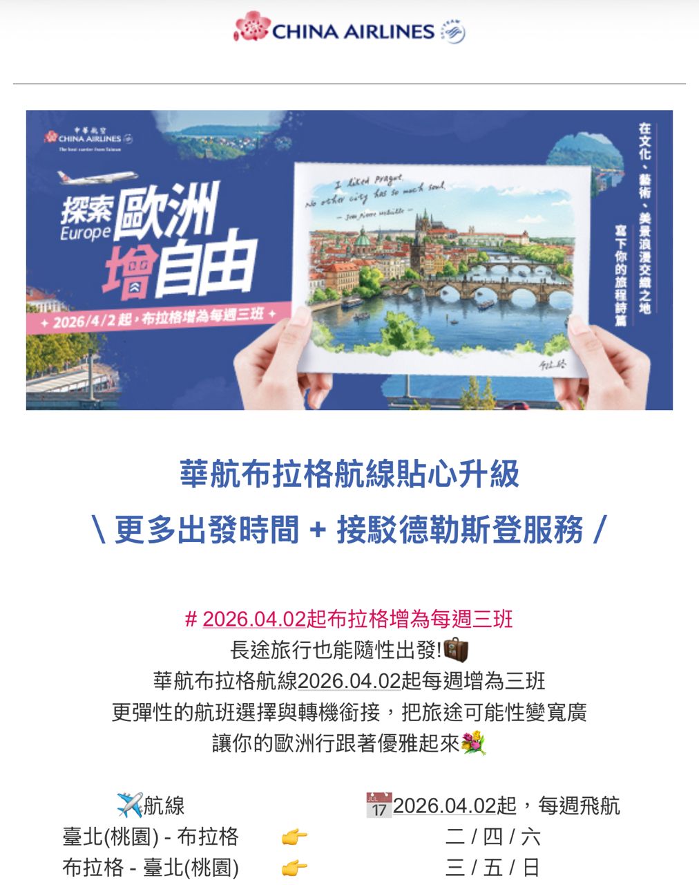 [閒聊] China Airlines 布拉格航線貼心升級!