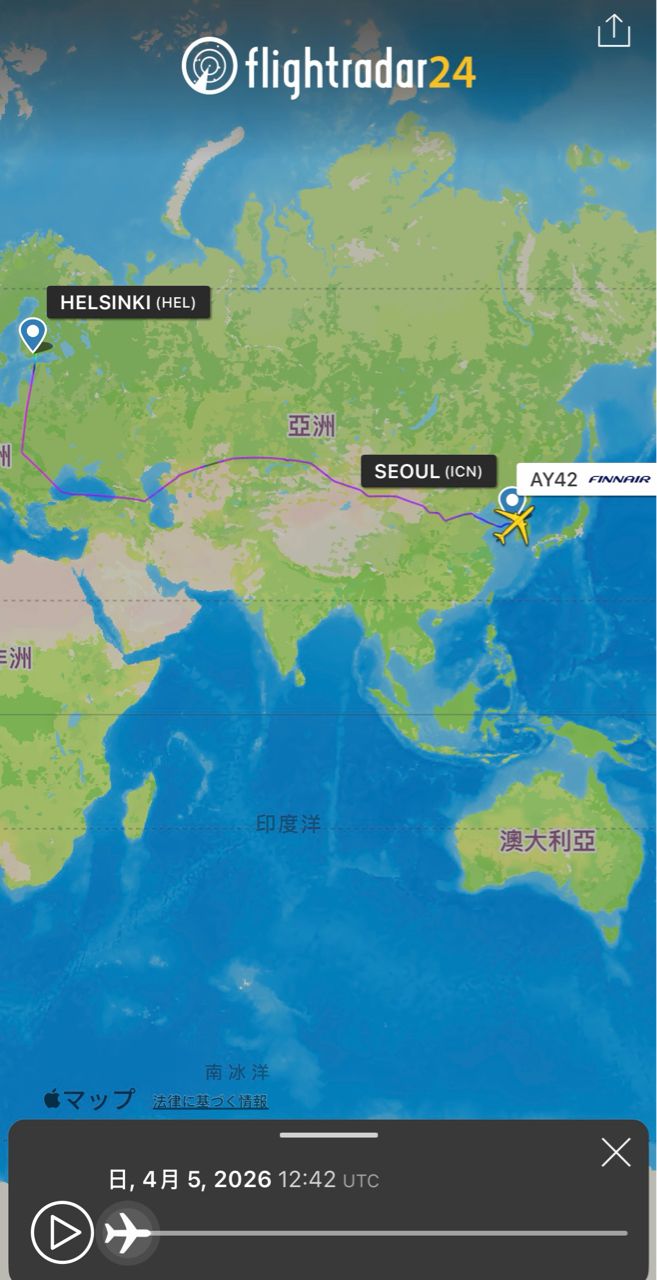 AY42 ICN-HEL這航班在4/5 前是往西飛經歐亞大陸