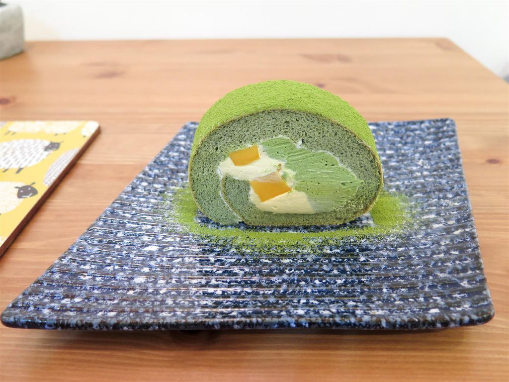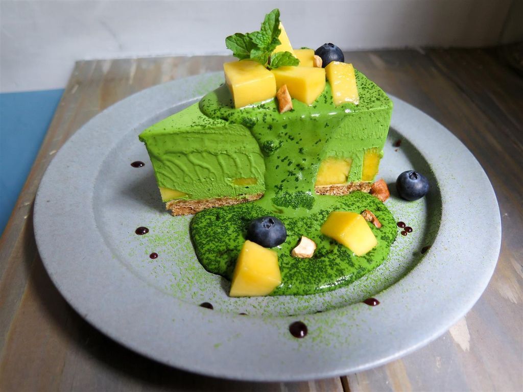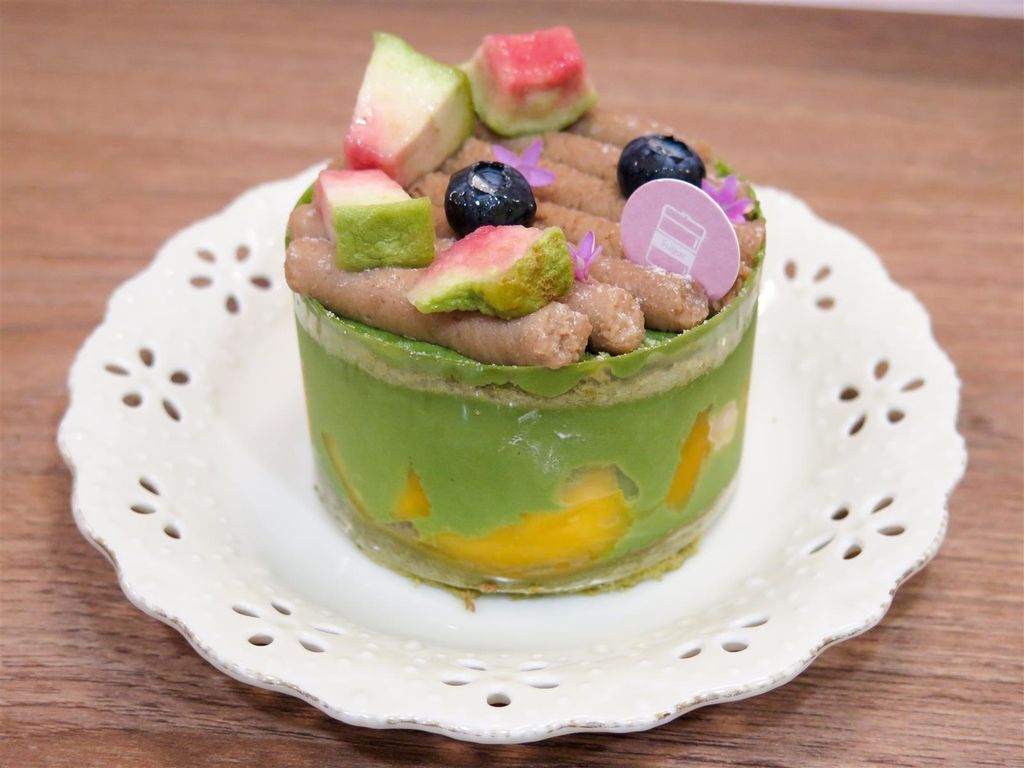 由抹茶海綿蛋糕、抹茶慕斯、抹茶布丁、愛文芒果和栗子泥組合成的,
