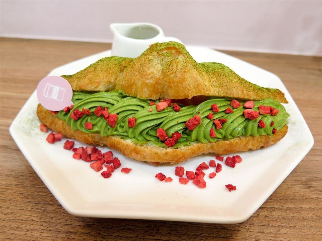 剛出爐的酥脆可頌麵包夾著滿滿濃抹微苦回甘的抹茶卡士達和鮮甜多汁的愛文芒果,