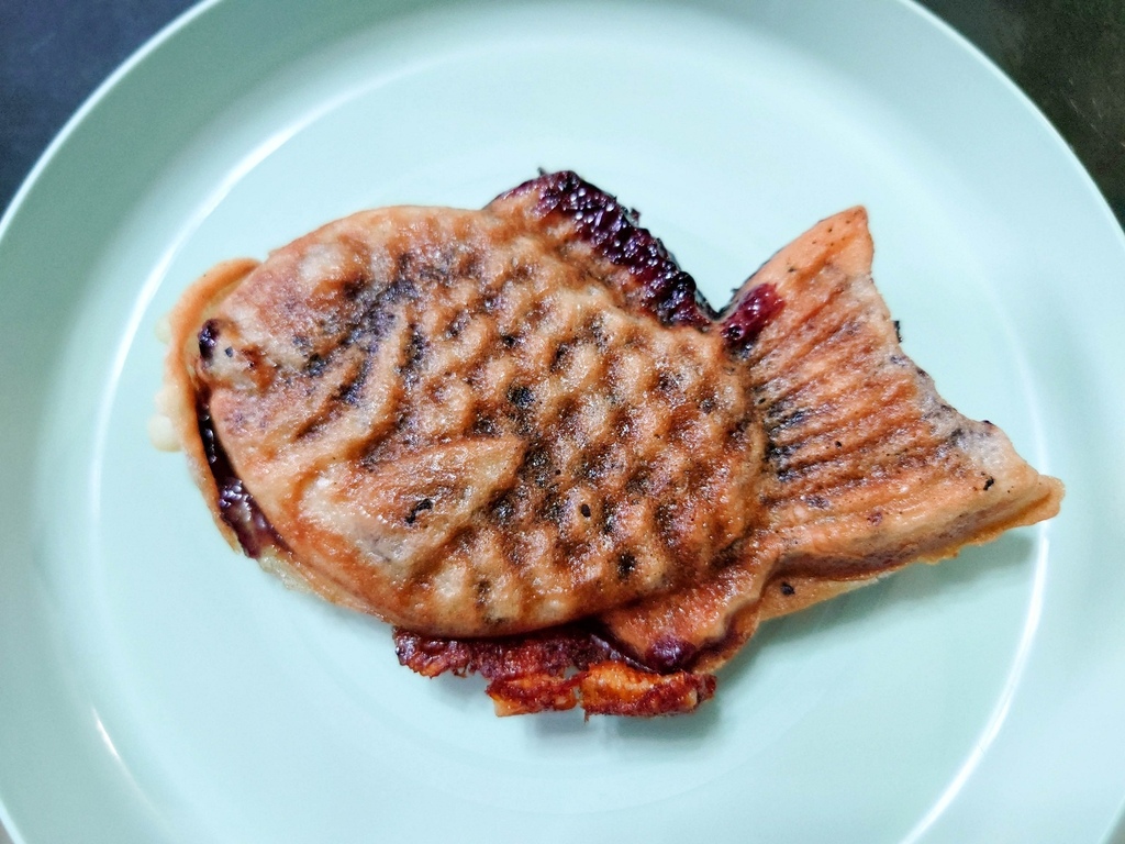 抹茶奶酥鯛魚燒在烘烤過程高溫使得抹茶奶酥的油脂滲到外皮上,