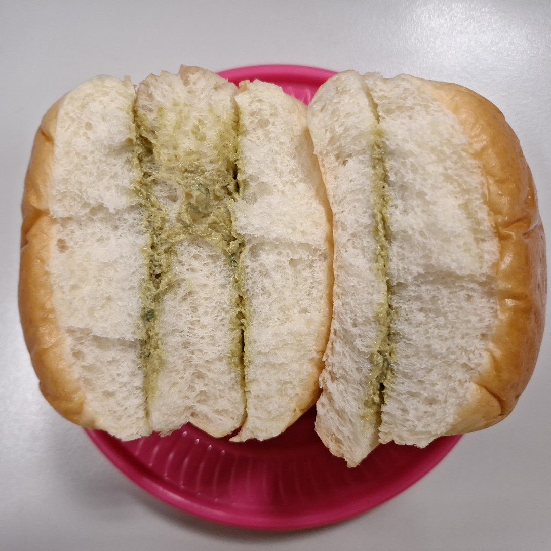 花生醬是有顆粒那種 跟香菜葉粉末混在一起抹在麵包夾心