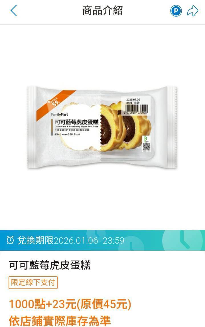 【商品名稱/價格】:可可藍莓虎皮蛋糕/兌點1000+$23(/原價$45)