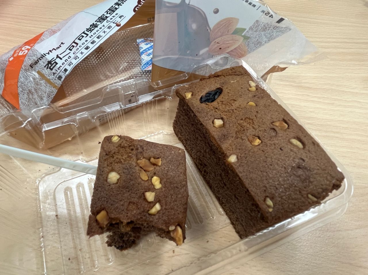 裡面有3塊,給的料還算多。蛋糕體吃起來偏濕潤,咀嚼同時有杏仁脆脆的口感,可可味