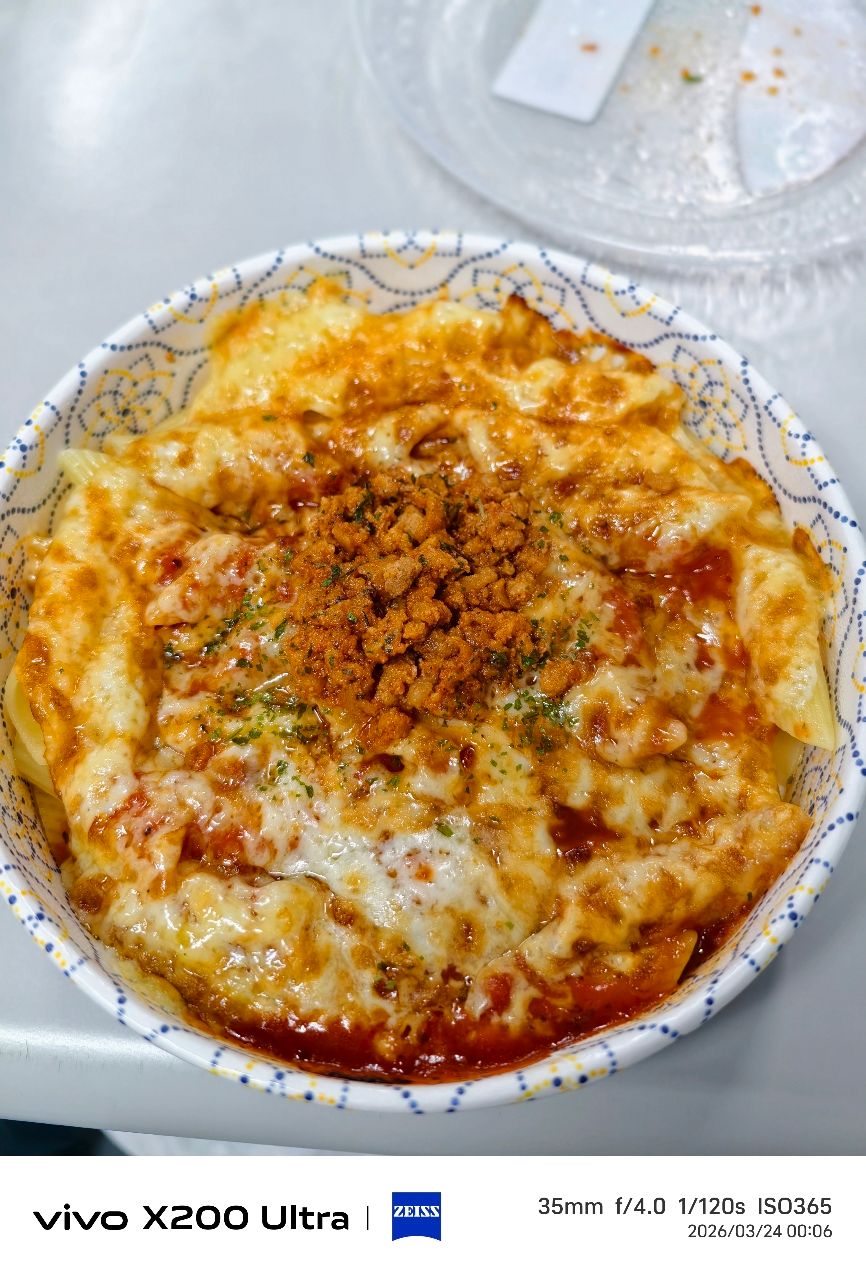 起司焗烤有感,表示起司用量還可以,但是麵真的太少,薄薄一層,味道還不錯,就番茄