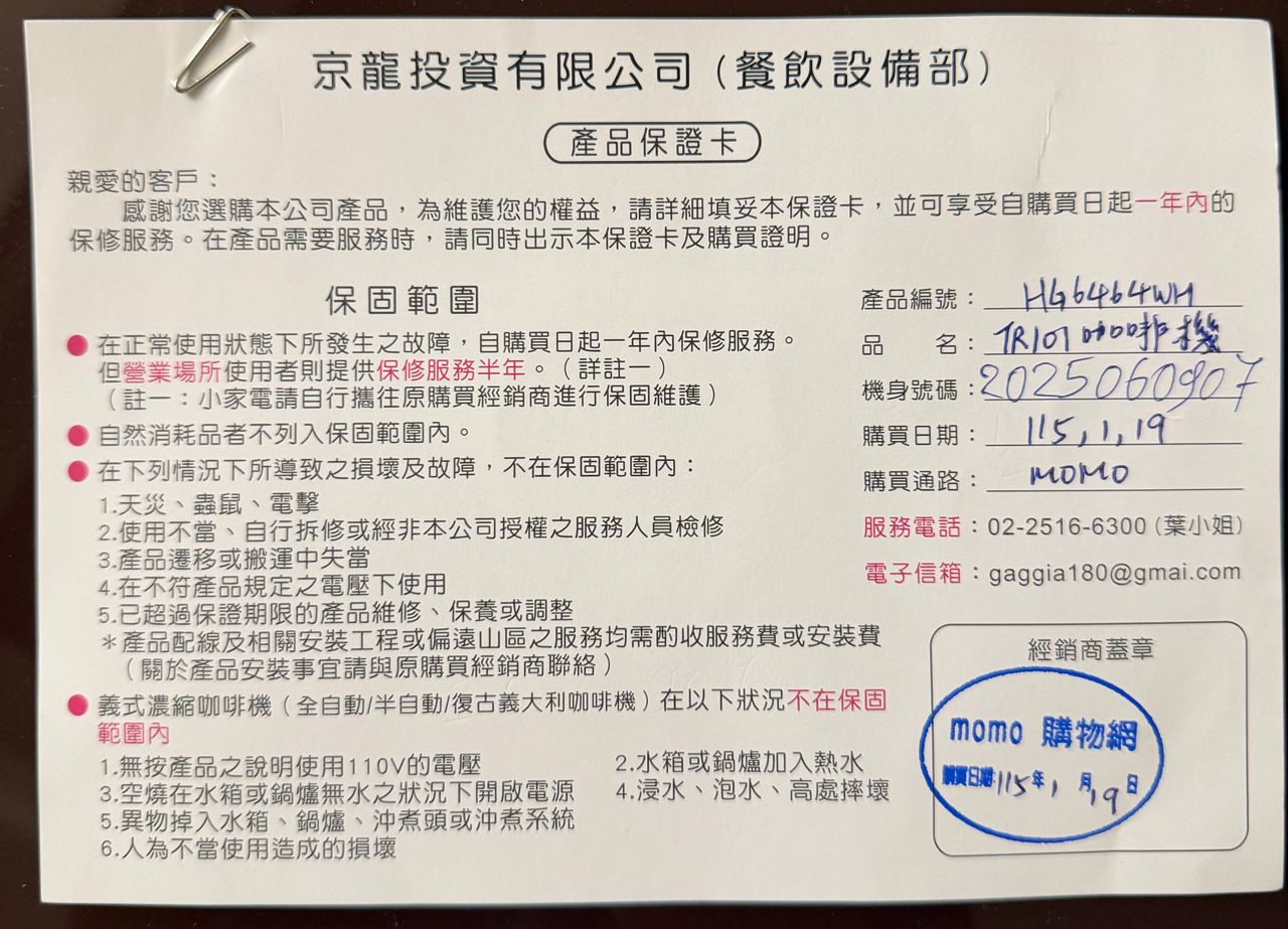 115年1月19日自Momo購入 保固內
