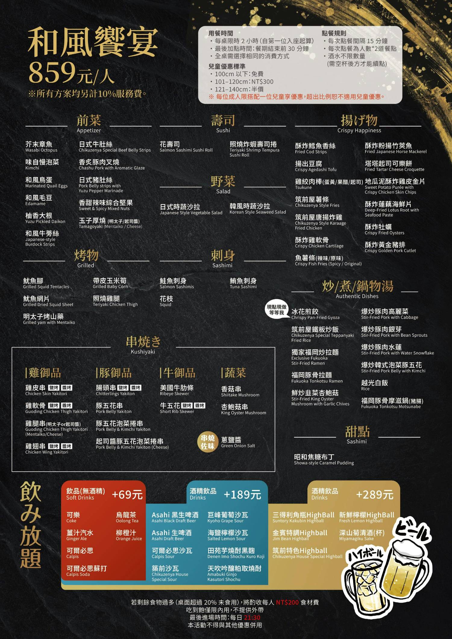 台北居酒屋吃到飽才859元!去年首次來台展店的日本人氣居酒屋「筑前屋」,今年選在