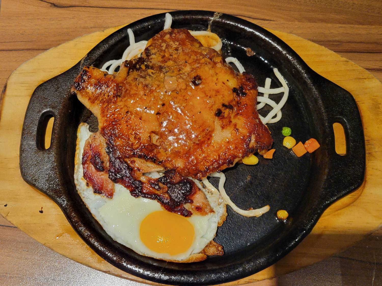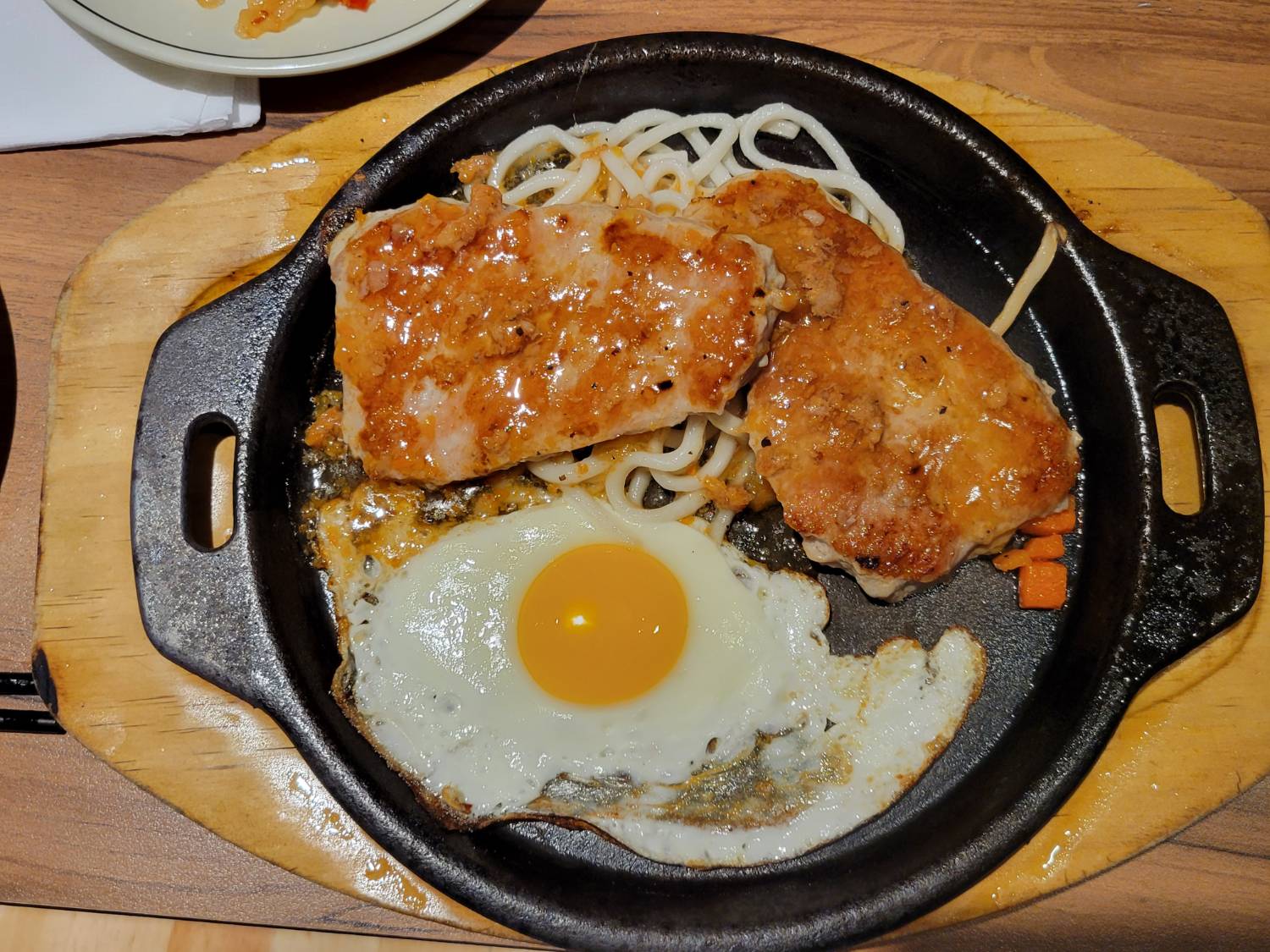 豬排厚實有咬勁,筋稍多。鐵板上尚有荷包蛋及些許鐵板