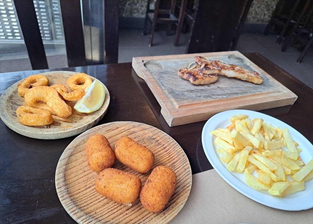牛排約9歐、半份炸火腿球(西班牙可樂餅)、半份炸魷魚、