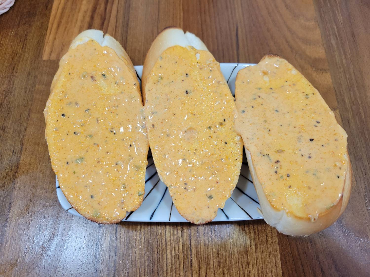 蒜香麵包有三塊,而且不是一般土司條,是大塊厚實的軟