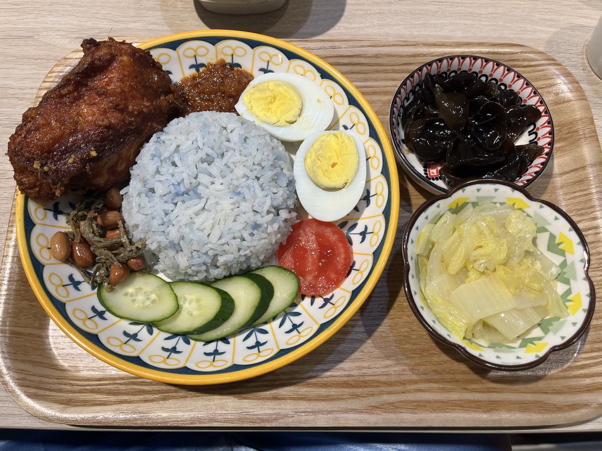 推薦菜色:蝶豆花椰漿飯配香料炸雞腿排/參巴辣椒蛋