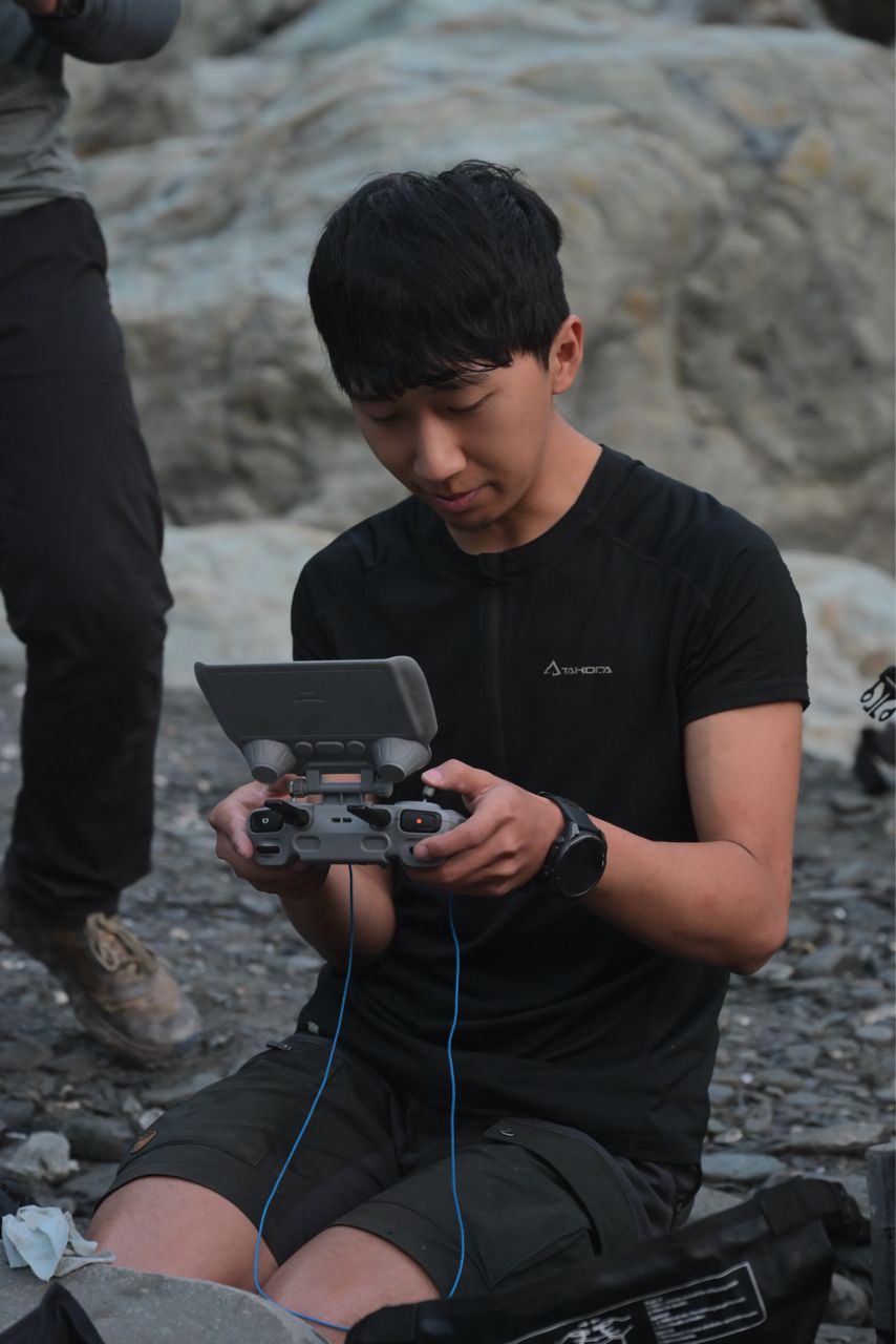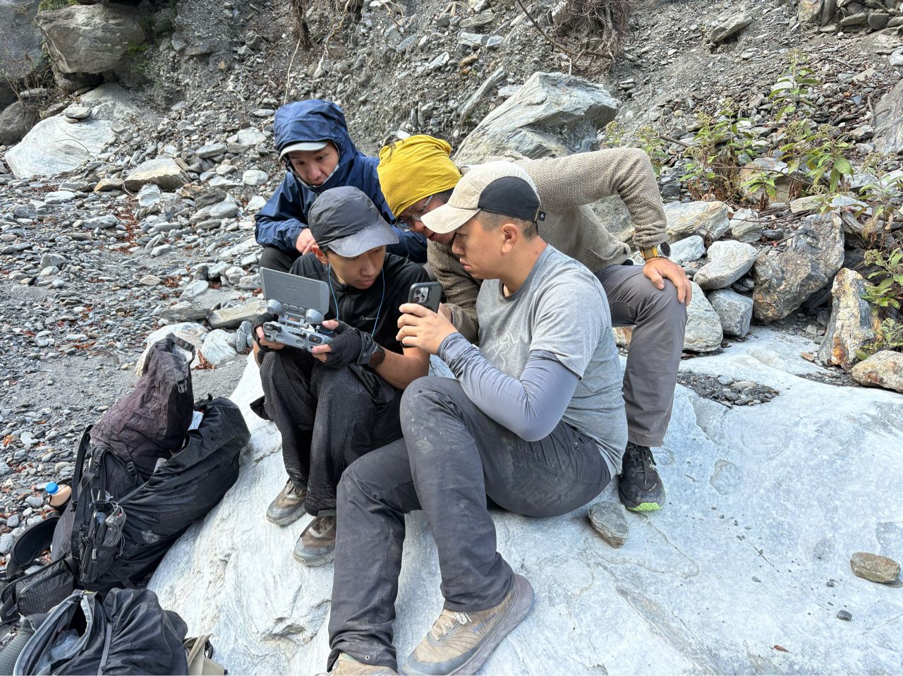 過溪後,左右為男看著空拍地形,研究瀑布與峽谷