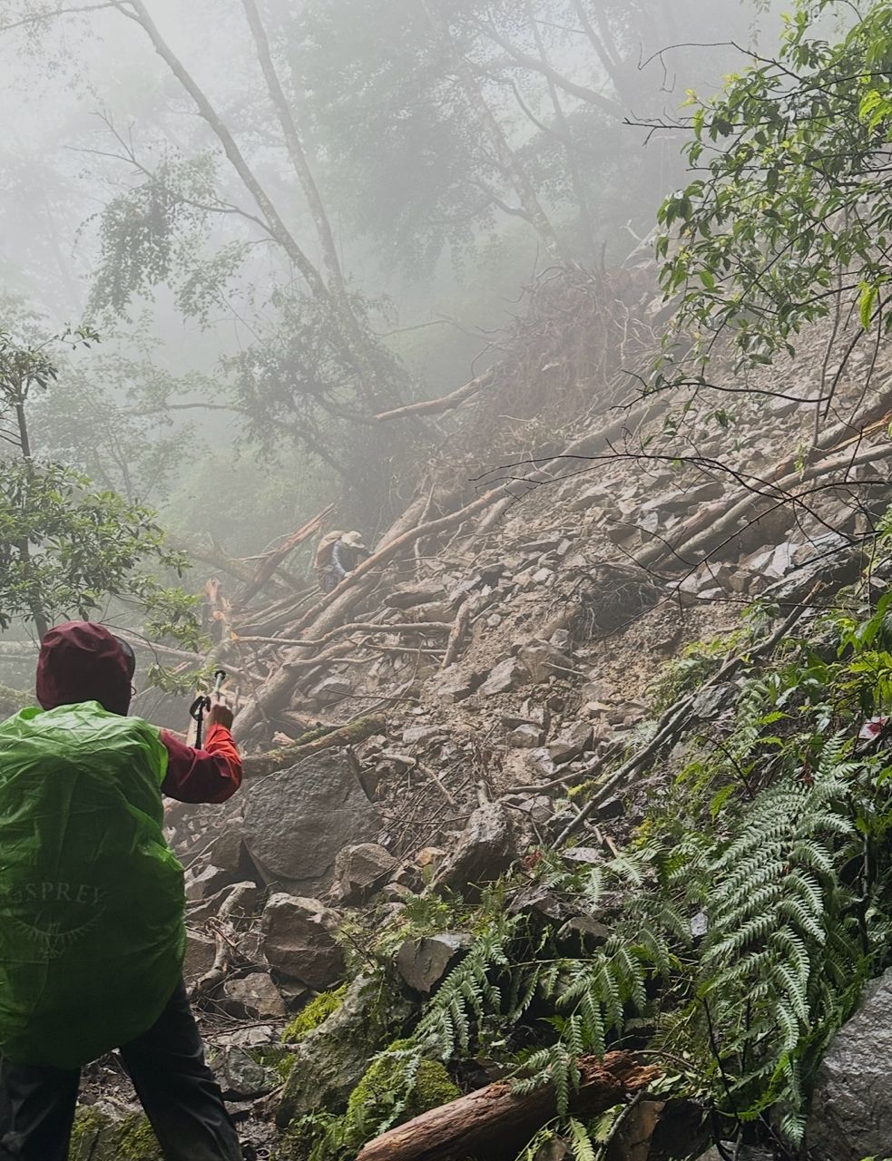 出發1分鐘、就卡在坍方處,爬來爬去爬不過去,只好等天亮