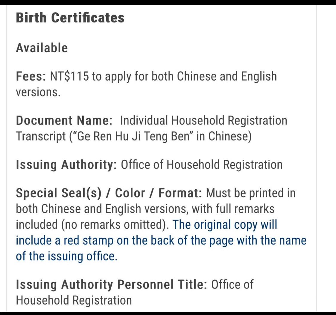 戶口,在中文記事上有記載,但英文版沒有;櫃檯人員說她們只會把出生醫院、結婚登記