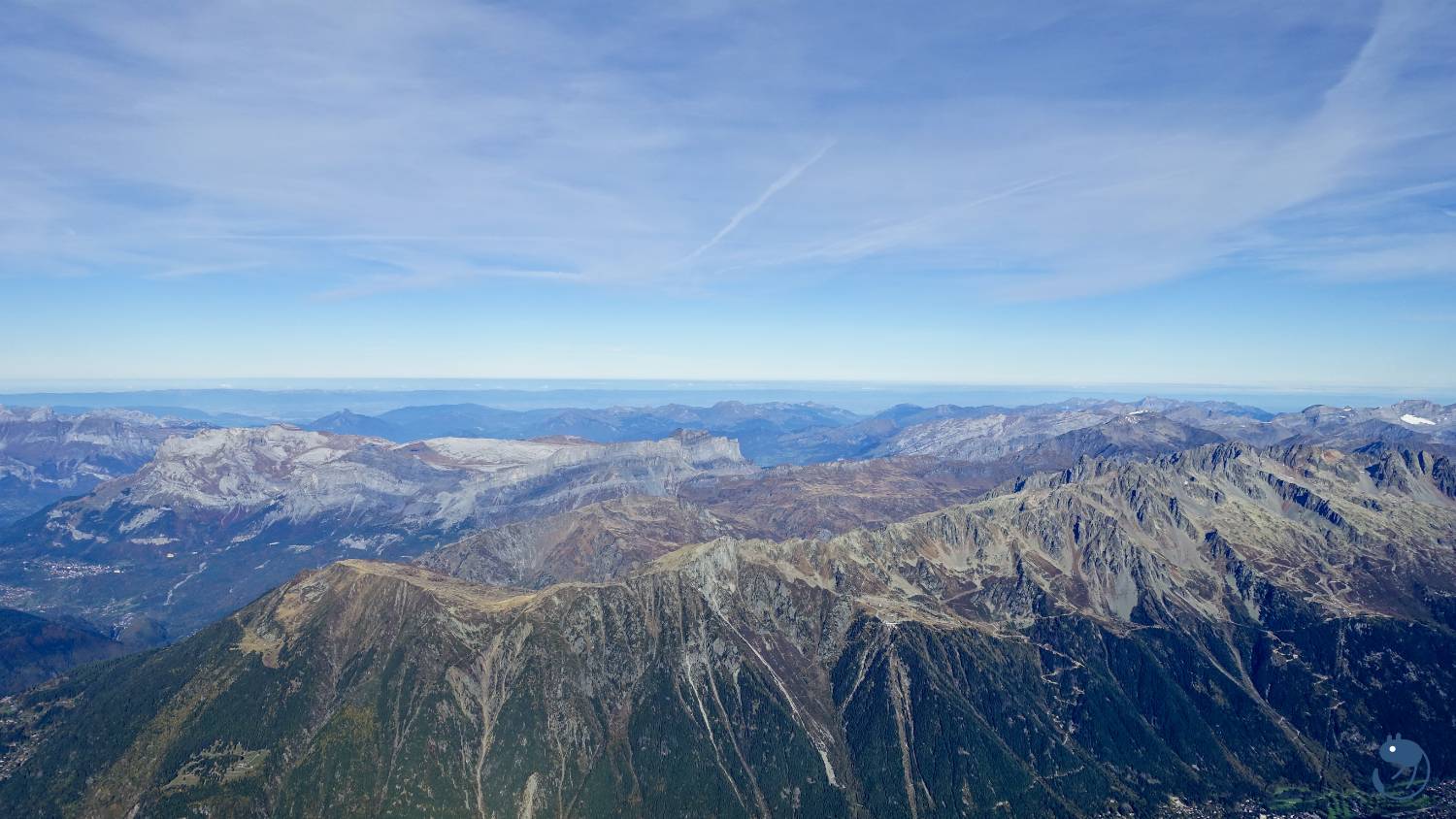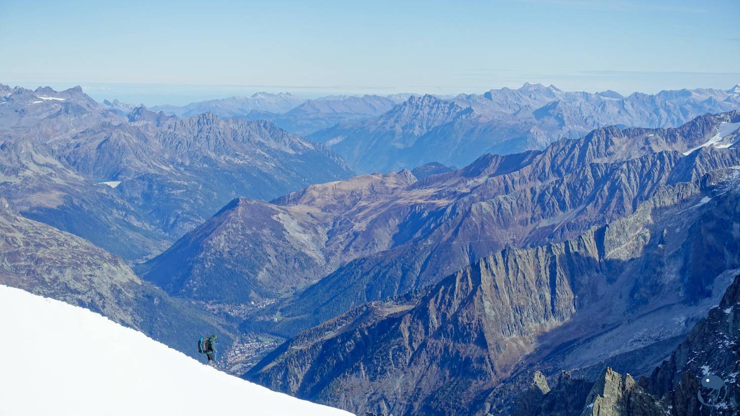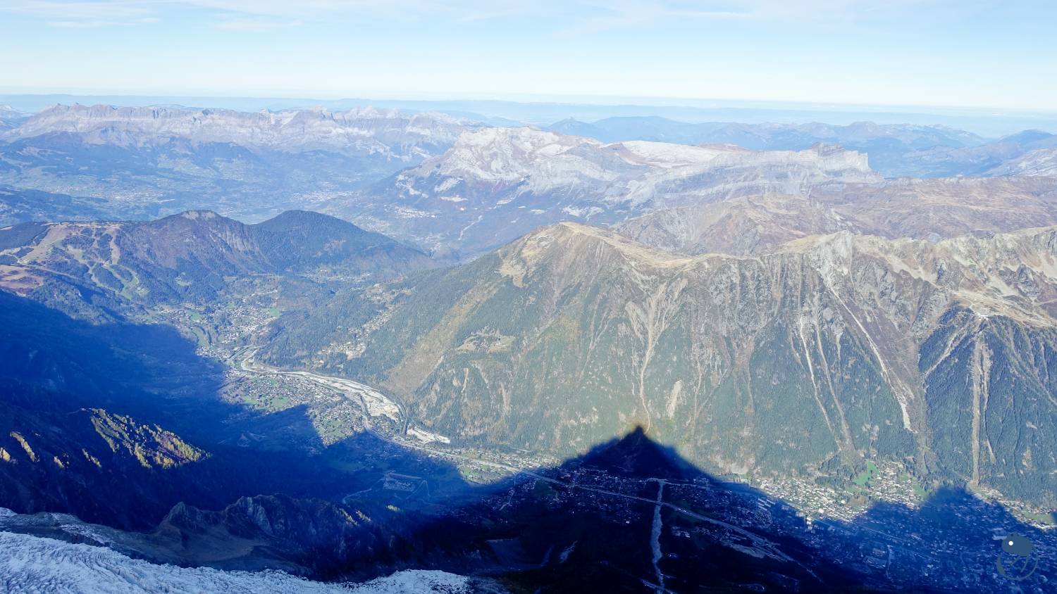 往西南方看去,最高的圓頂雪山就是歐洲最高峰-海拔4,808公尺的白朗峰(Mont Blanc)