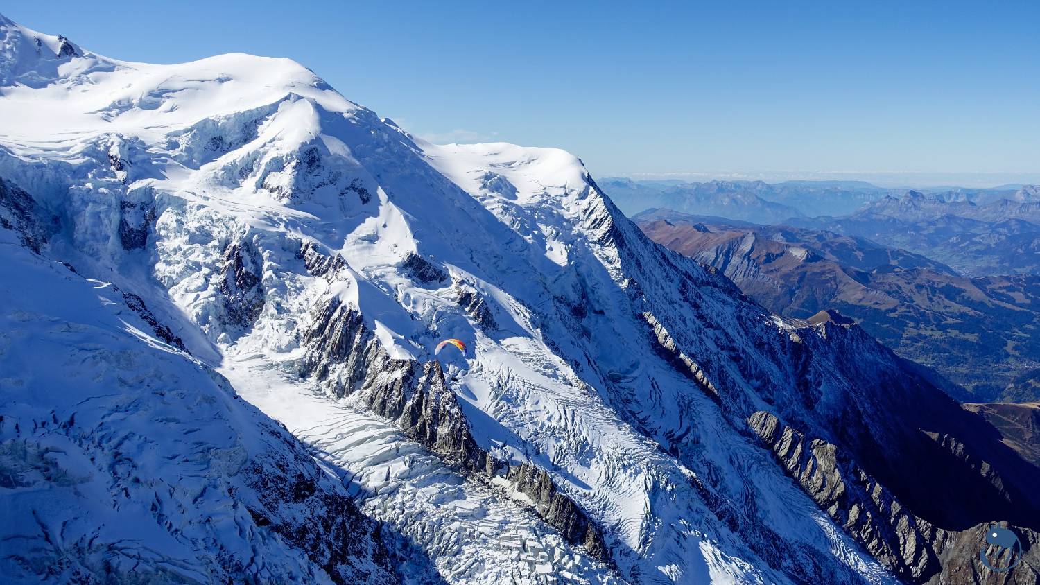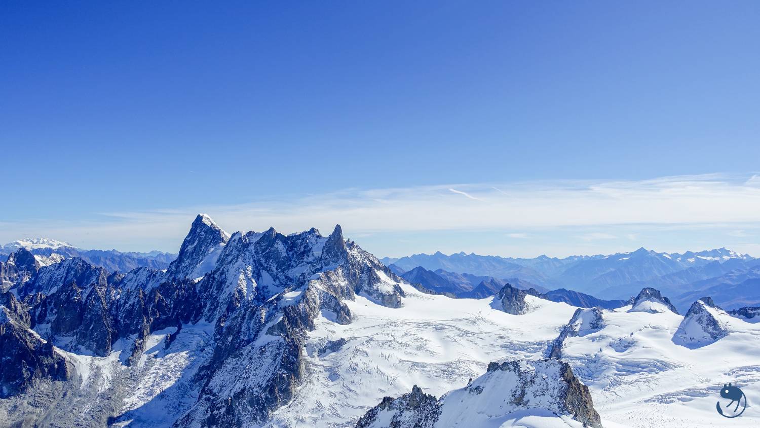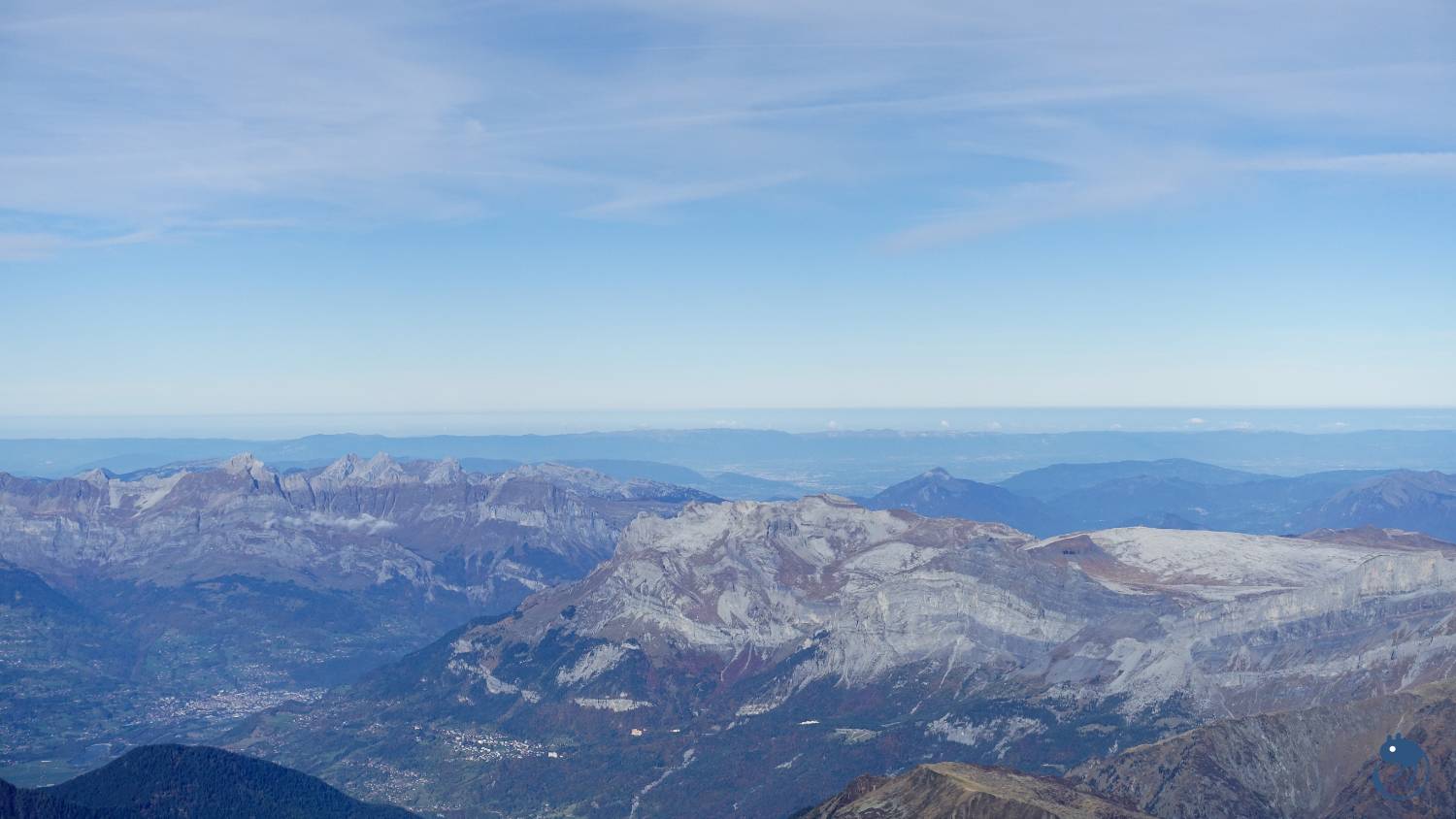 往西南方看去,最高的圓頂雪山就是歐洲最高峰-海拔4,808公尺的白朗峰(Mont Blanc)