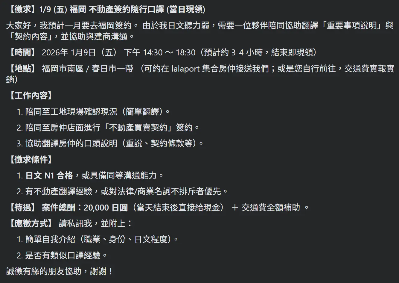 【徵求】不動產簽約隨行口譯 (當日現領)