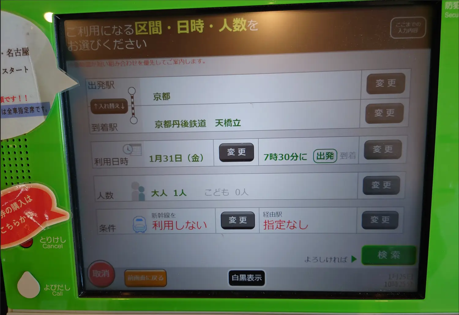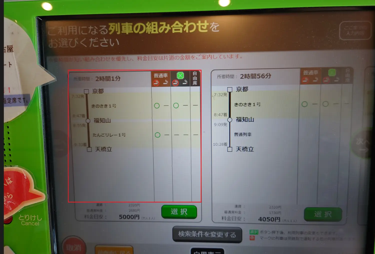 間。若領出票券後,需至綠色窗口請站員「改票或退票重訂」,以便將原有JR路線變更為含丹後鐵