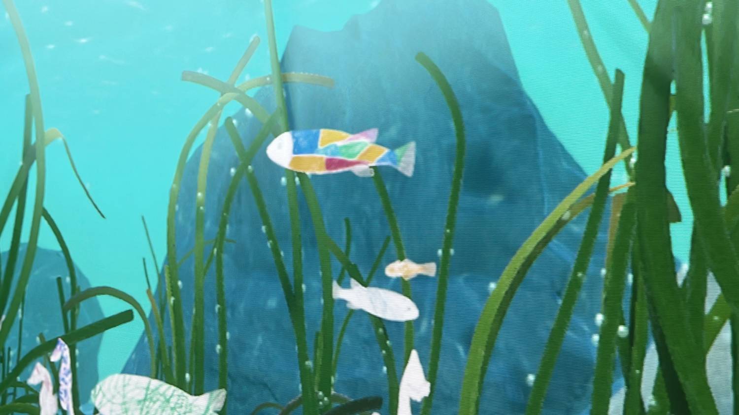 有一區可以自己創作並投影到螢幕上,我畫了色塊魚,互動性還不錯。