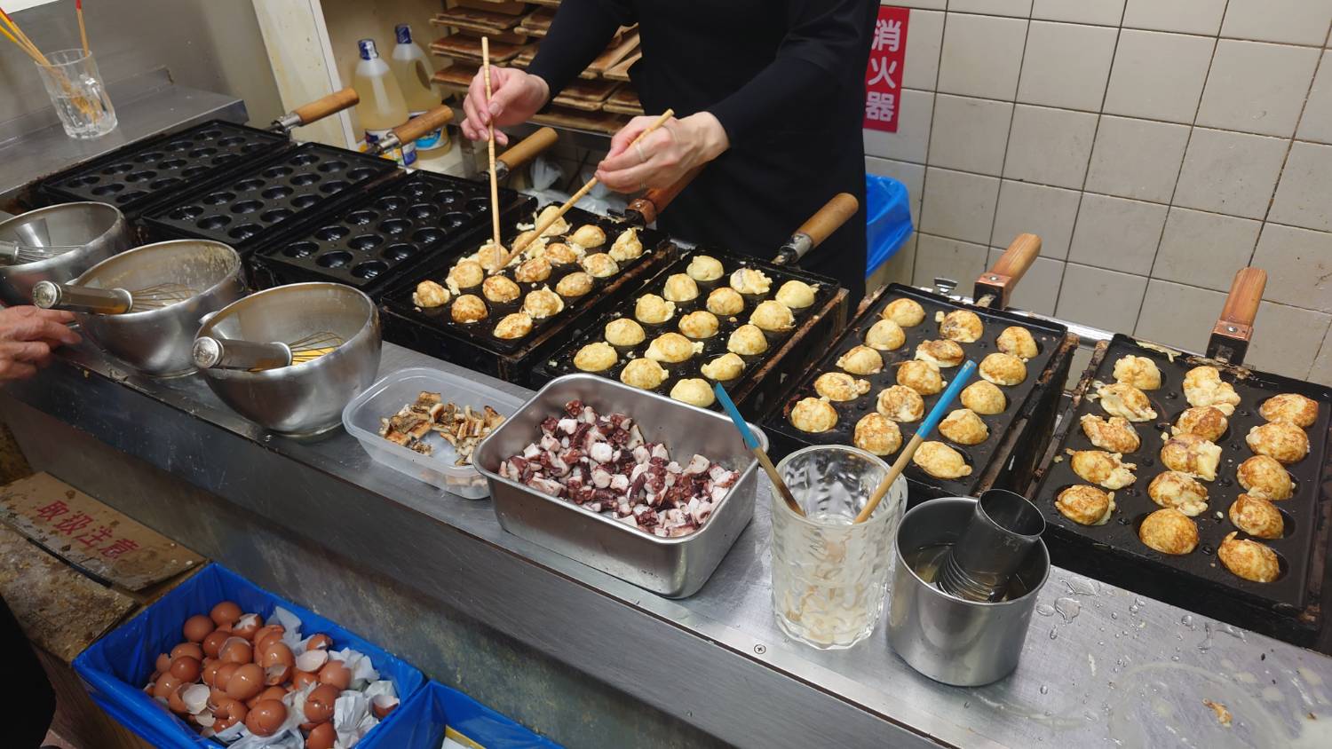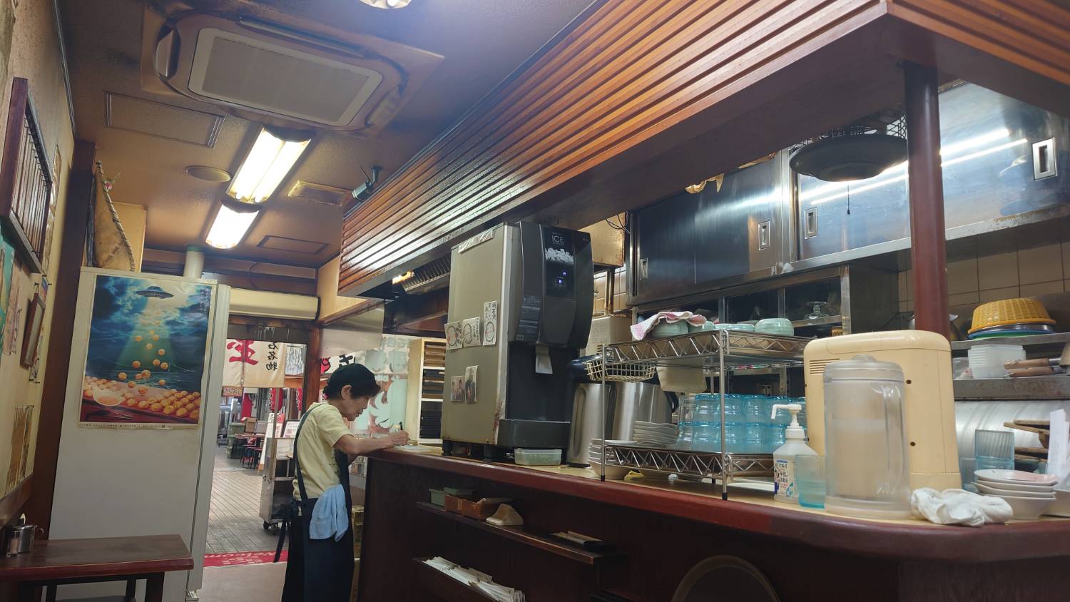 從門口進去右手邊是櫃台,左手邊是烤明石燒的地方跟廚房,