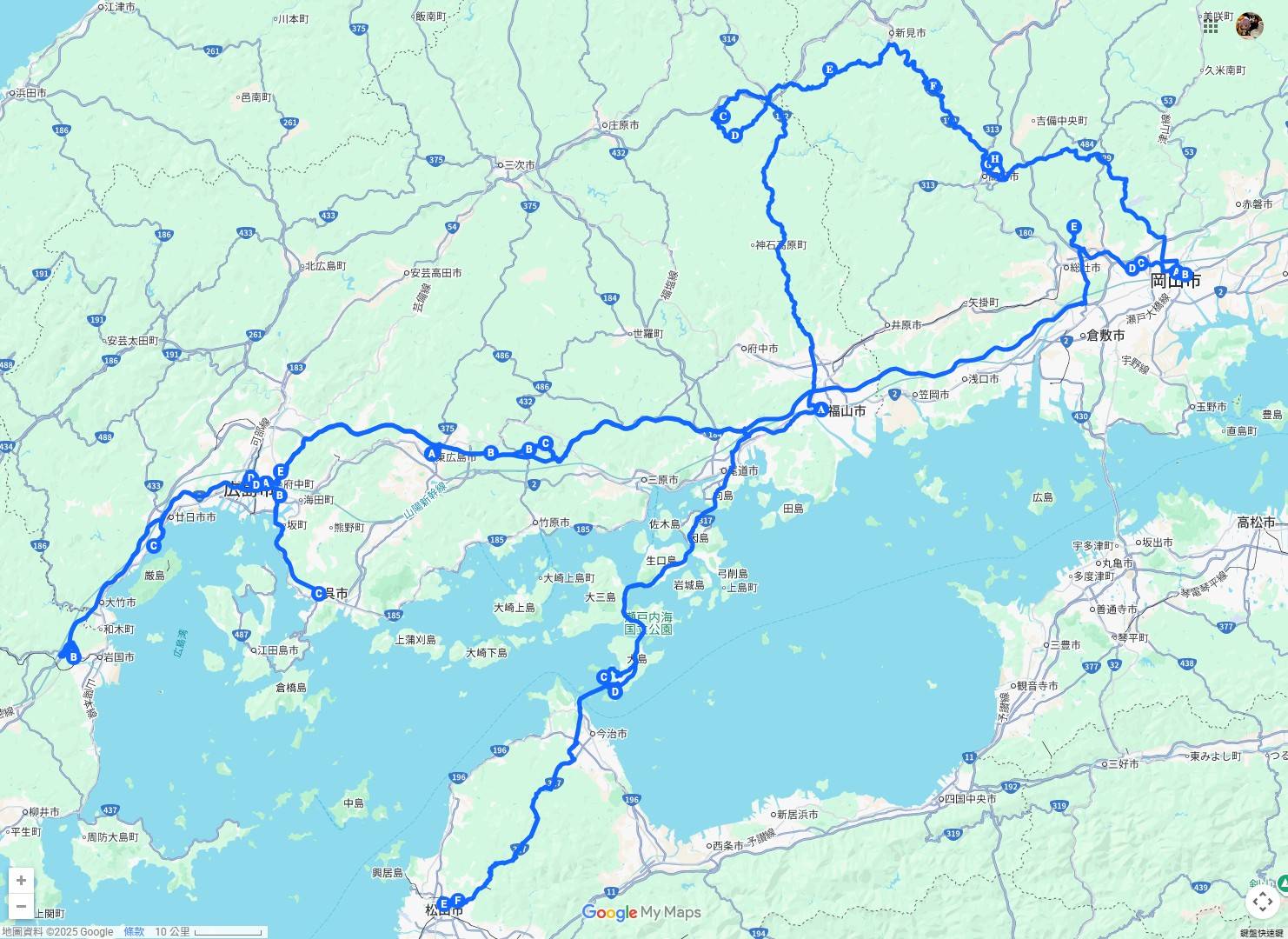 10/5:廣島機場進入燈橋梁→來島海峽大橋(龜老山)→松山城→福山