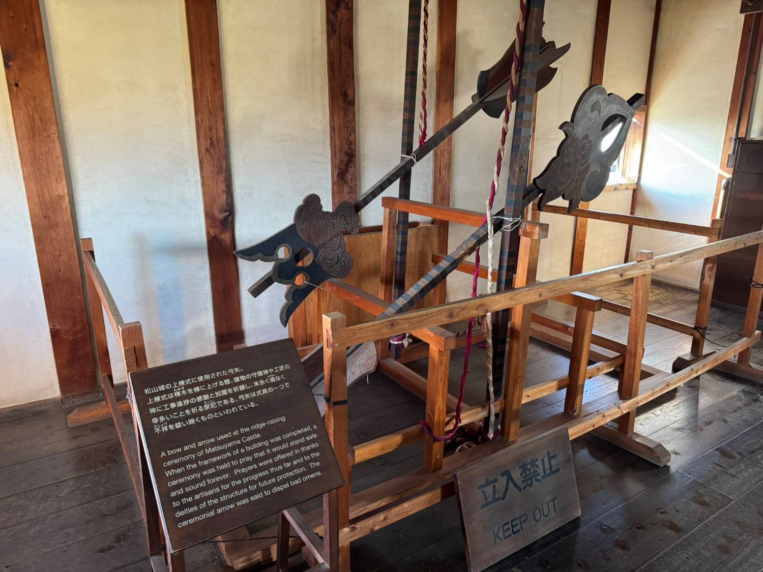 然後先前往小天守的二樓,這裡展示著松山城上梁儀式時使用的弓矢