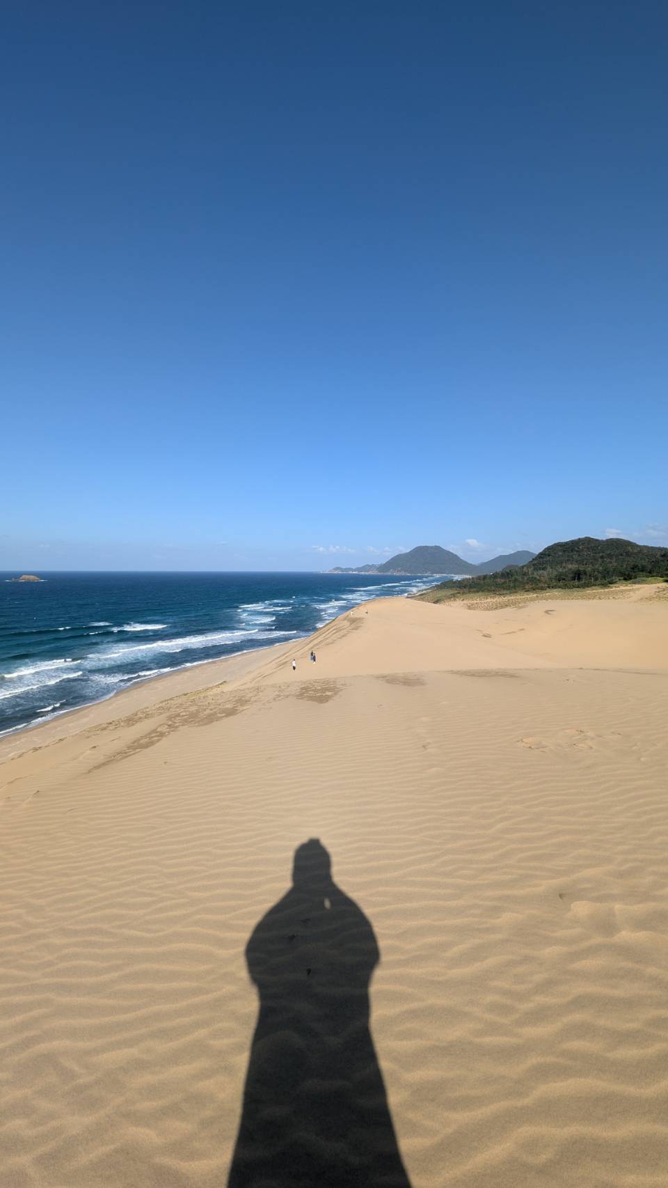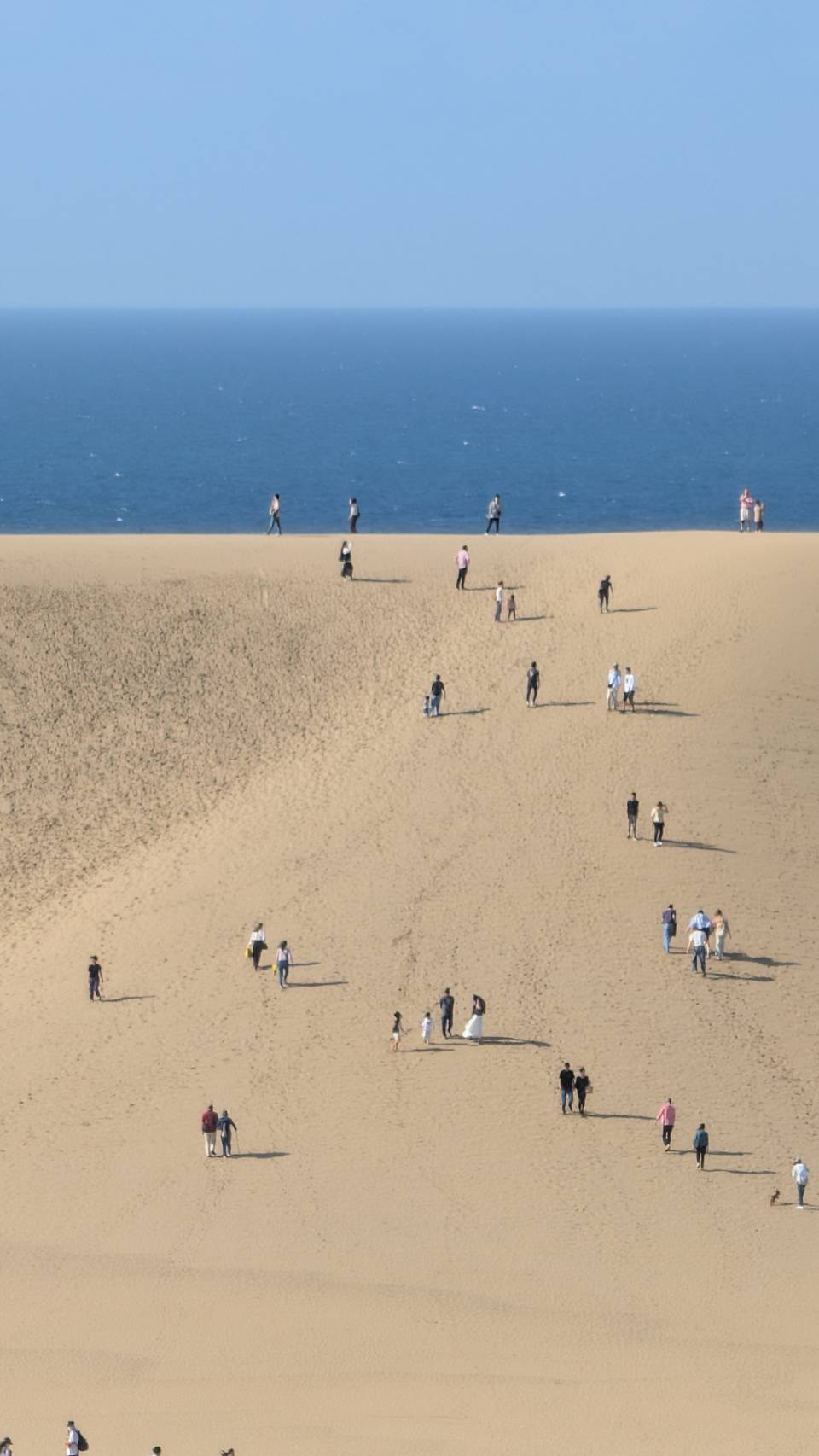 砂丘、晴空與海洋構成的遼闊畫面,人是一個一個小黑點,點綴在砂丘上