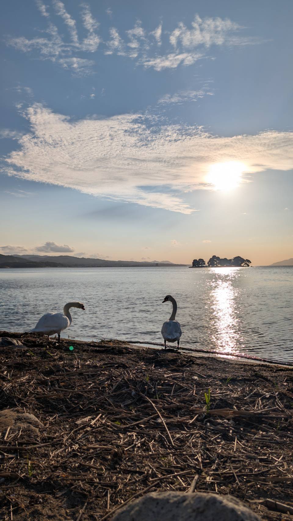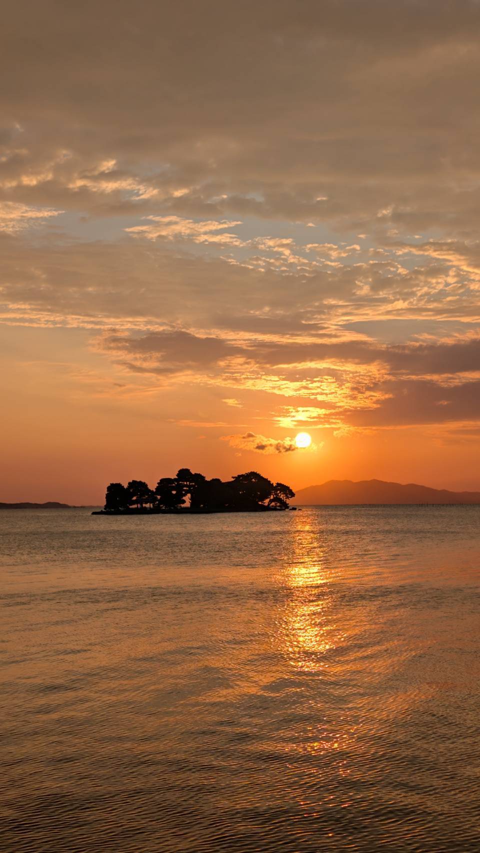 嫁島與夕陽構成的光影,風吹在湖面上映射出的波光