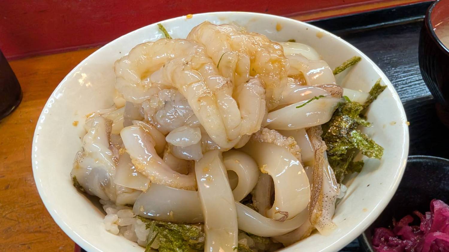 我點了猛者蝦+白烏賊丼,鮮甜的沒話說,外表不怎麼樣但卻如此美味