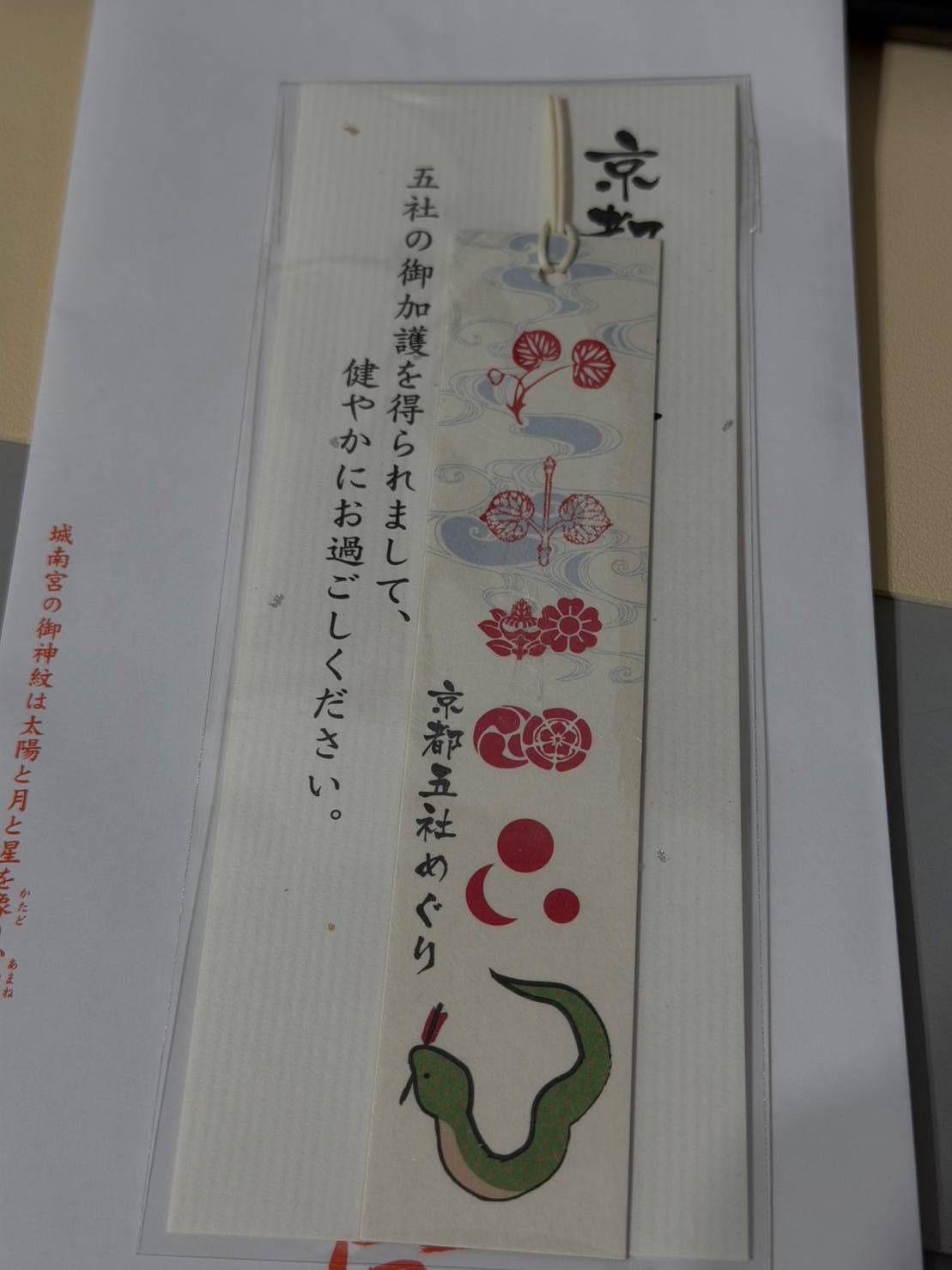 作為完成巡禮的證明,收到印有該年度生肖的書籤。有了五社的加護,今年肯定能夠一帆