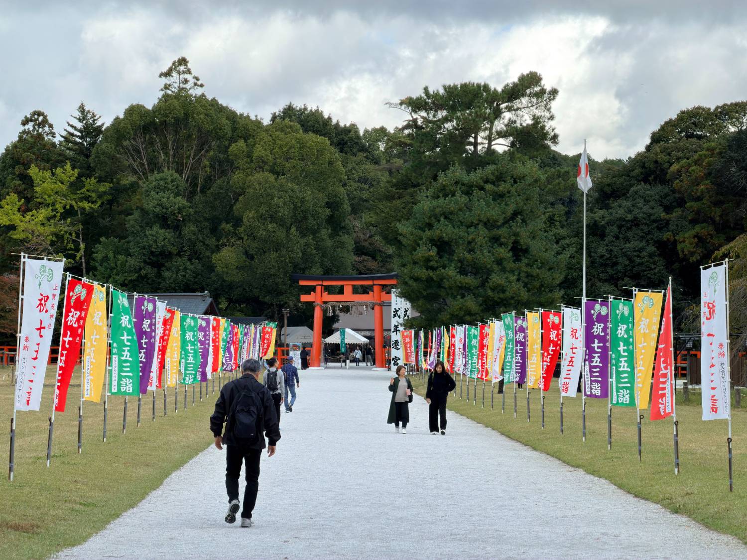 為接近七五三節,神社境內充滿許多帶著穿和服的小朋友來參拜兼拍照的家長。