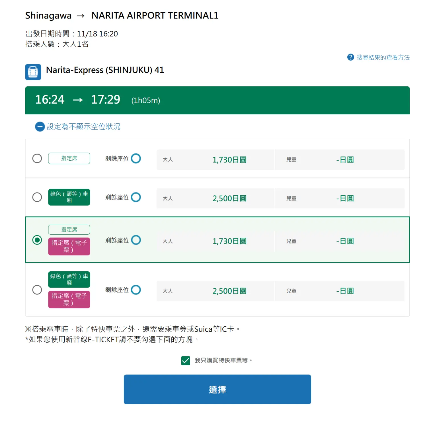 JR東日本的EKINET買成田特快(乘車券+特急券)