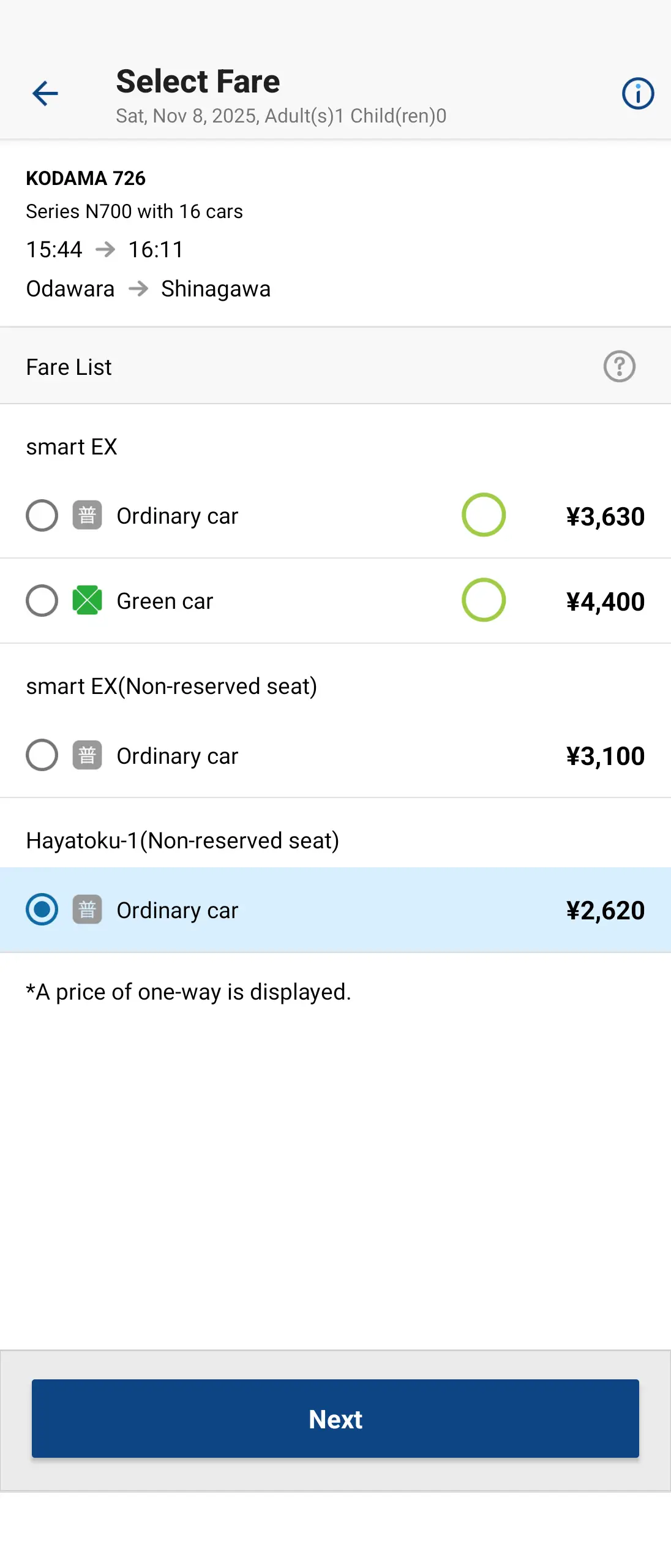 : 各位好,因預計某平日下午從小田原站搭乘東海道新幹線到品川(15:44-16:11),再由品川