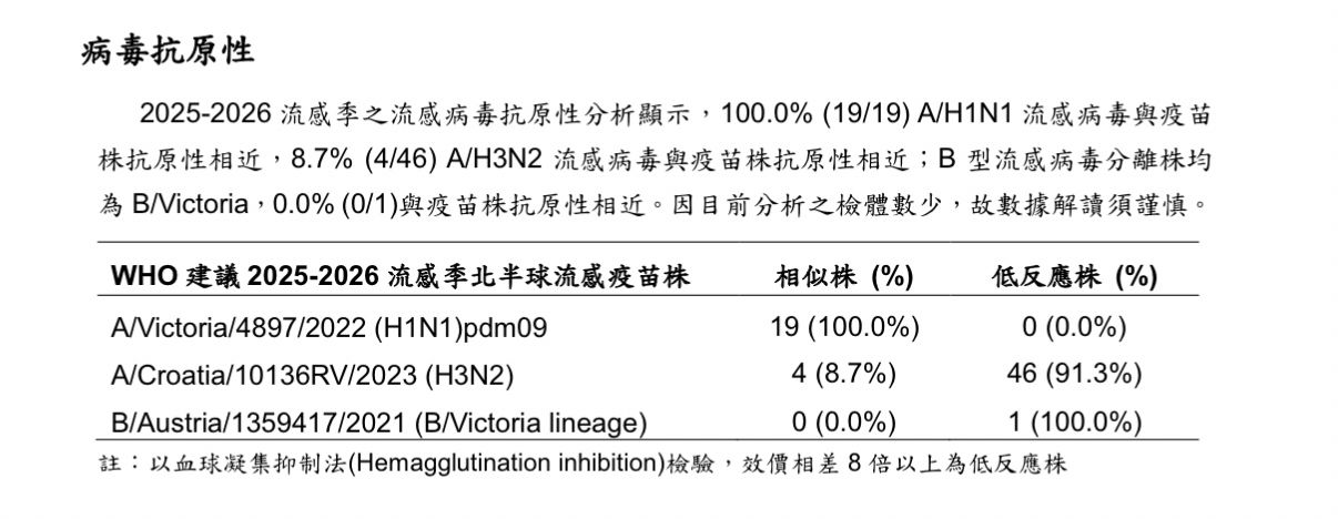 病毒檢驗結果顯示,A 型流感中的 H3N2 以 85.9% 的比例,成為今年的主流病毒株。去