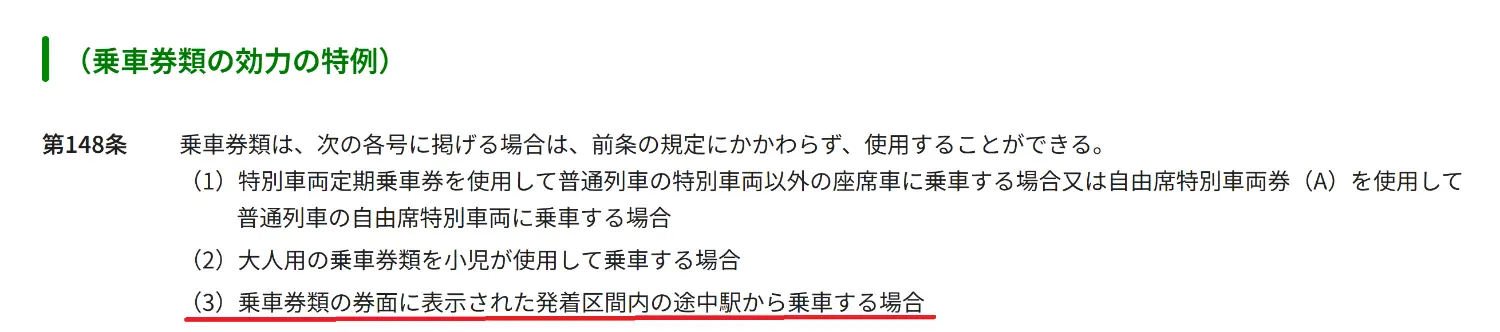 若自「乘車券類」所載之發着區間內的中間站途中上車(日文:内方乗車),其使用方式