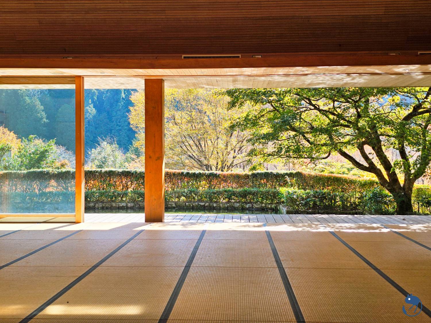 接著慢慢往上走到篠脇山莊,坐在濡緣上欣賞著水面映照到屋簷天花上的光影以及茅草屋