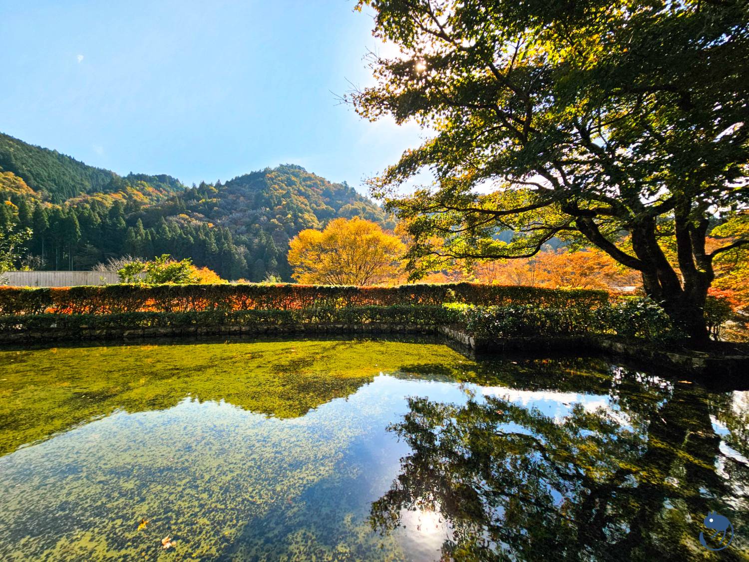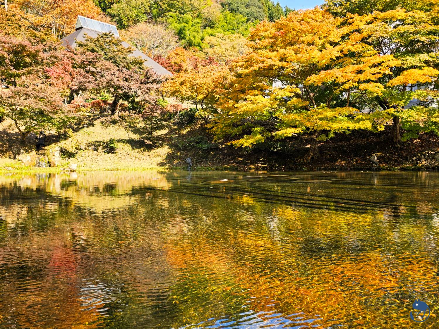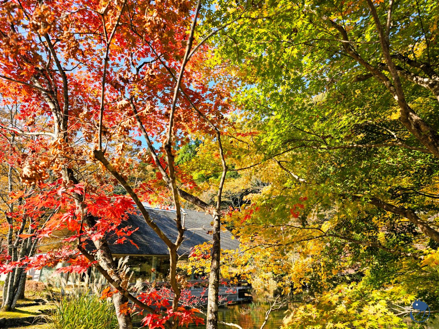 博物館內利用當地食材烹飪的正宗法式餐廳 ももちどり旁的秋日景色。