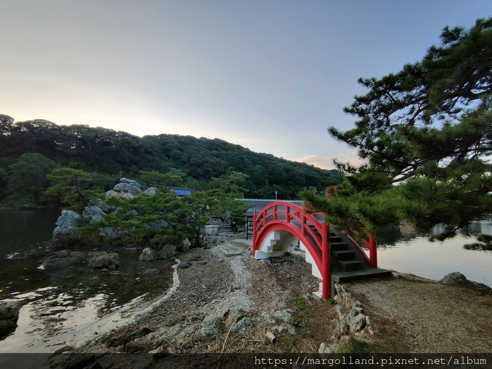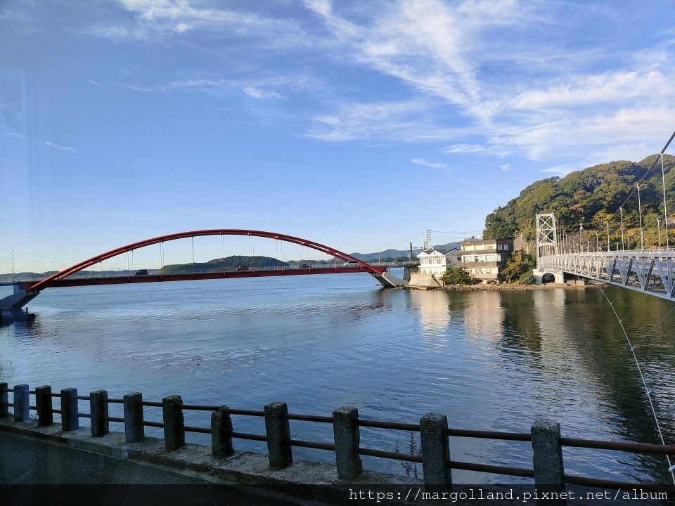 早上的濱名湖,窗戶看出去的景色,是天藍湖靛,旁邊的橋也別有風情,松島館的地理位